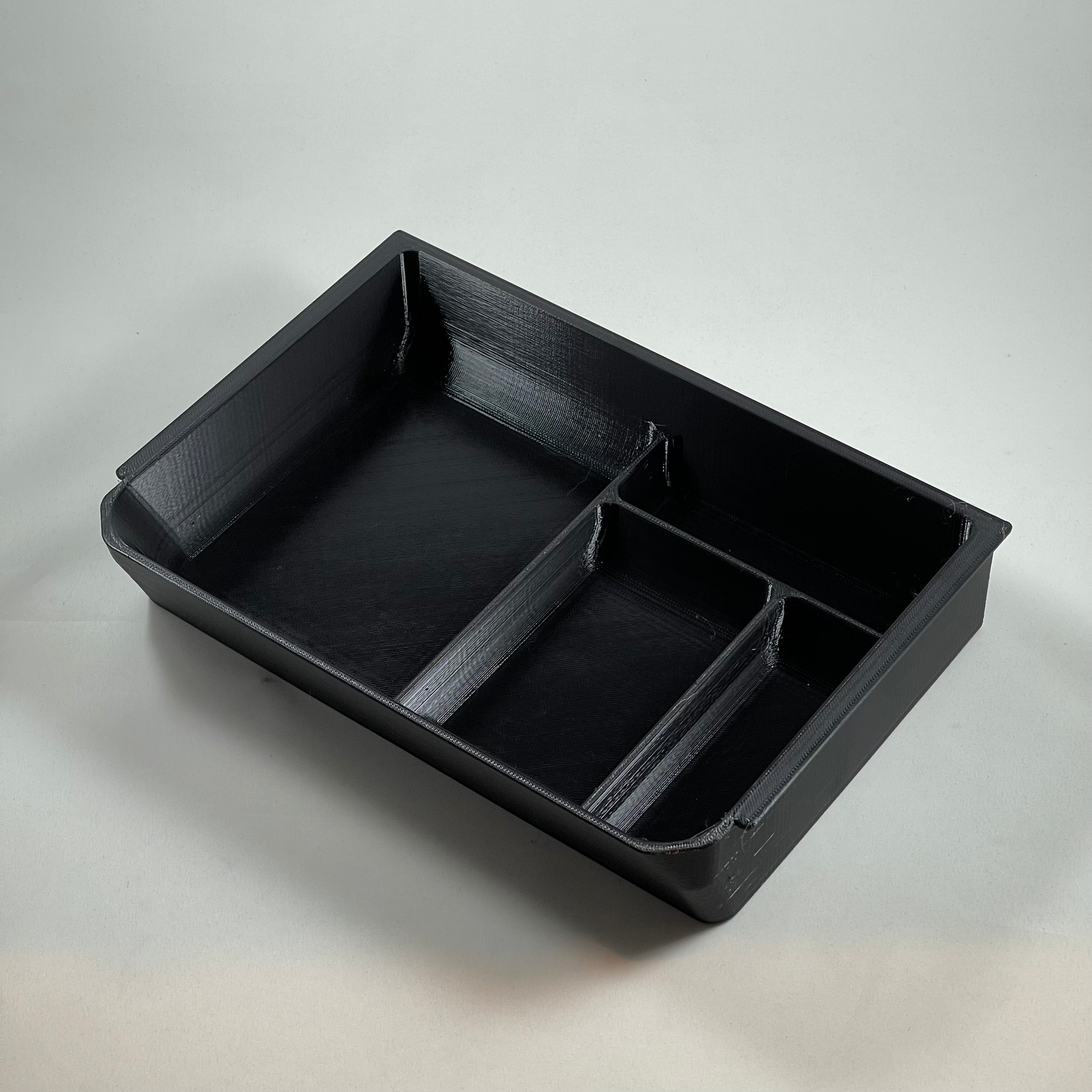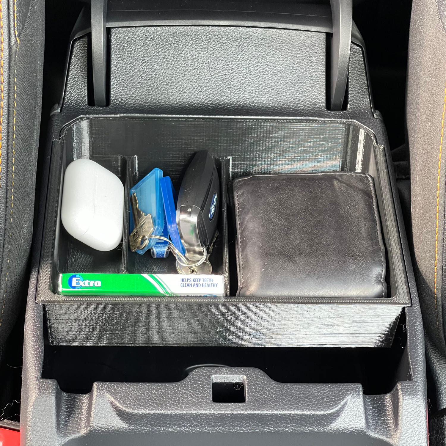 Available with or without dividers, this tray provides ample space to store your wallet, purse, keys, mints, and other small items. Engineered to effortlessly slide into place using the indents in your centre console, it fits snugly without interfering with the interior, allowing the console lid to close as usual.