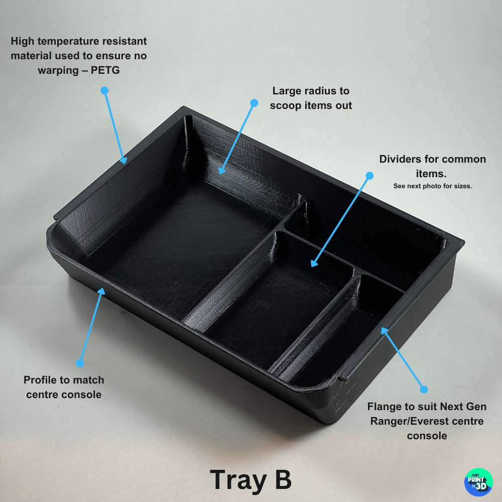 Introducing a bespoke storage solution tailored specifically for the 2022+ Next Gen Ranger / Everest centre console. Crafted with precision and care in Australia, our 3D printed tray is designed to keep your essentials organized and secure during your travels. Say goodbye to the frustration of items rolling around in your vehicle.