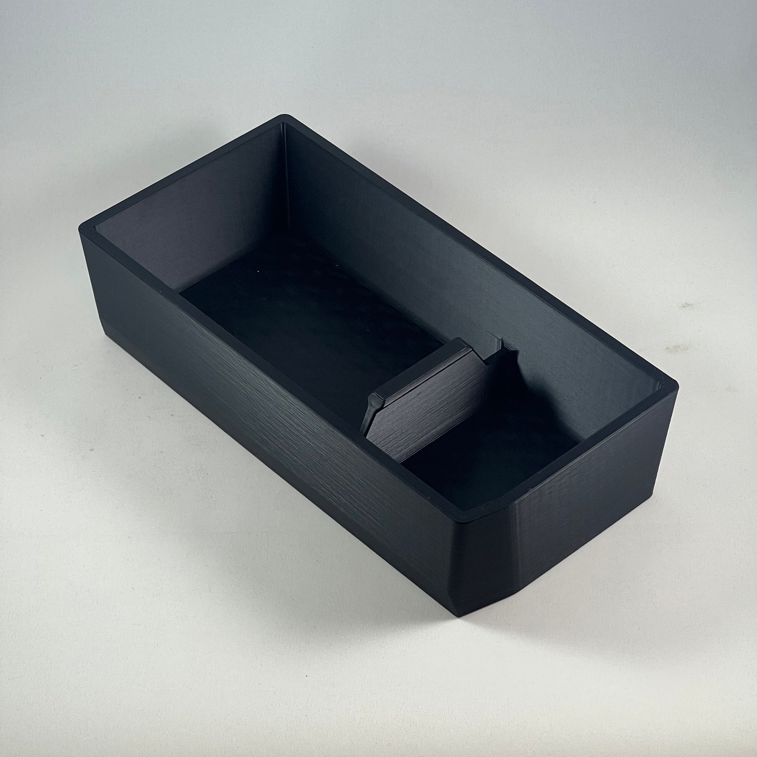 Quick and effortless slide-in/out functionality with use of drafted edges. Generous radius on the bottom allows for easy retrieval of items. Ensures normal closure of the console lid with no rubbing. Constructed from high-temperature resistant PETG material to prevent warping.